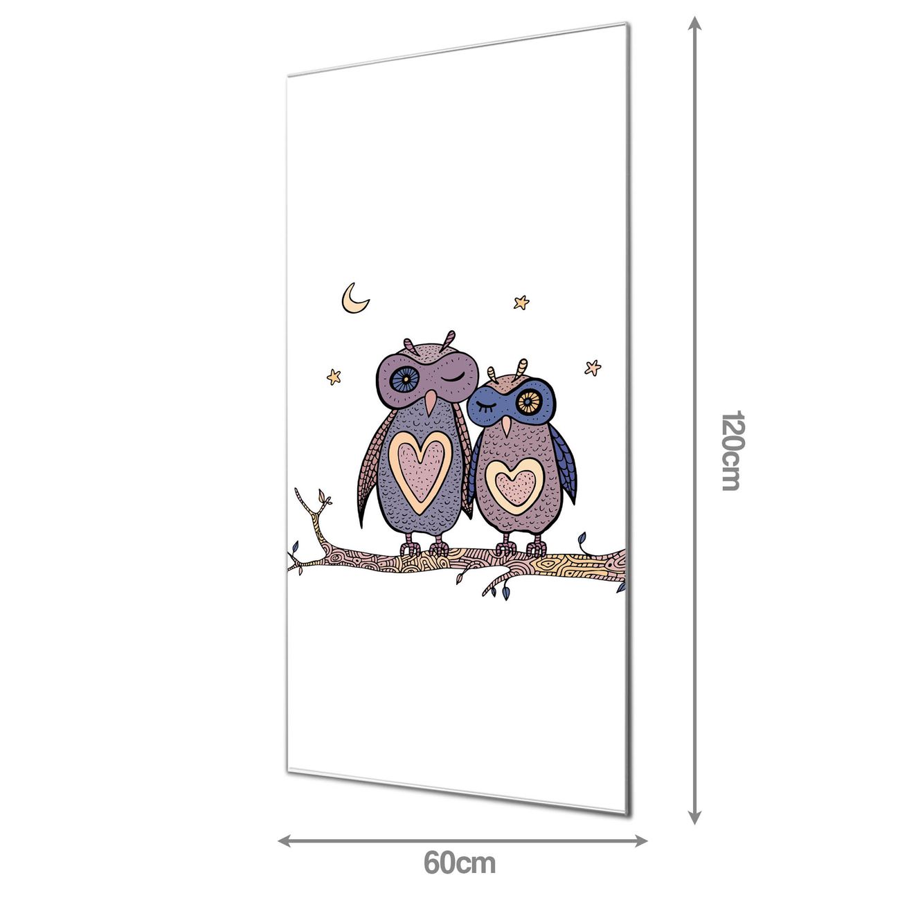 Material: 4mm Sicherheitsglas mit Metallrückwand Eigenschaften: beschreibbar, magnetisch, kratzfest Maße: 60x120x0,6cm, 10,80 kg schwer Motiv Nummer 10757 Verliebte Eulen Zubehör: inklusive 4 Neodym-Magnete