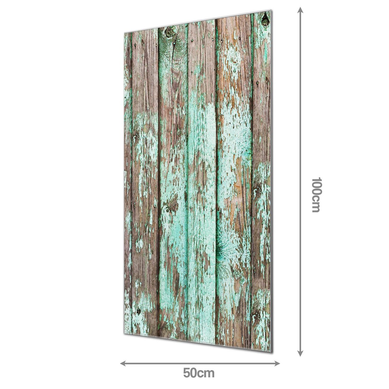 Material: 4mm Sicherheitsglas mit Metallrückwand Eigenschaften: beschreibbar, magnetisch, kratzfest Maße: 50x100x0,6cm, 7,50 kg schwer Motiv Nummer 12180 Verwittertes Holz Zubehör: inklusive 4 Neodym-Magnete