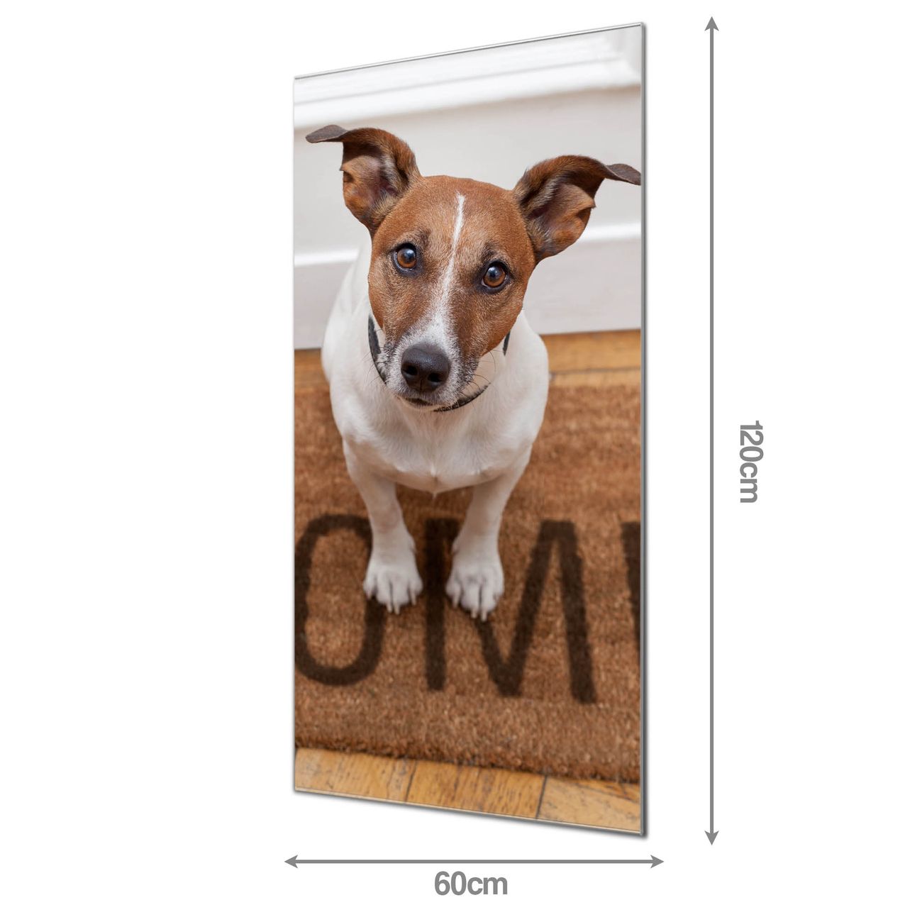 Material: 4mm Sicherheitsglas mit Metallrückwand Eigenschaften: beschreibbar, magnetisch, kratzfest Maße: 60x120x0,6cm, 10,80 kg schwer Motiv Nummer 10476 Wachhund Jack Russel Zubehör: inklusive 4 Neodym-Magnete