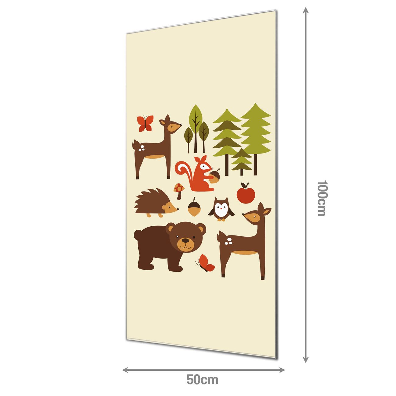 Material: 4mm Sicherheitsglas mit Metallrückwand Eigenschaften: beschreibbar, magnetisch, kratzfest Maße: 50x100x0,6cm, 7,50 kg schwer Motiv Nummer 10990 Waldfreunde Zubehör: inklusive 4 Neodym-Magnete