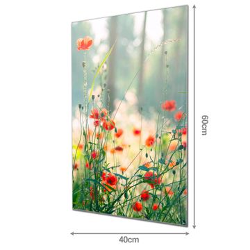 Material: 4mm Sicherheitsglas mit Metallrückwand Eigenschaften: beschreibbar, magnetisch, kratzfest Maße: 40x60x0,6cm, 3,60 kg schwer Motiv Nummer 12779 Waldmohn Zubehör: inklusive 4 Neodym-Magnete