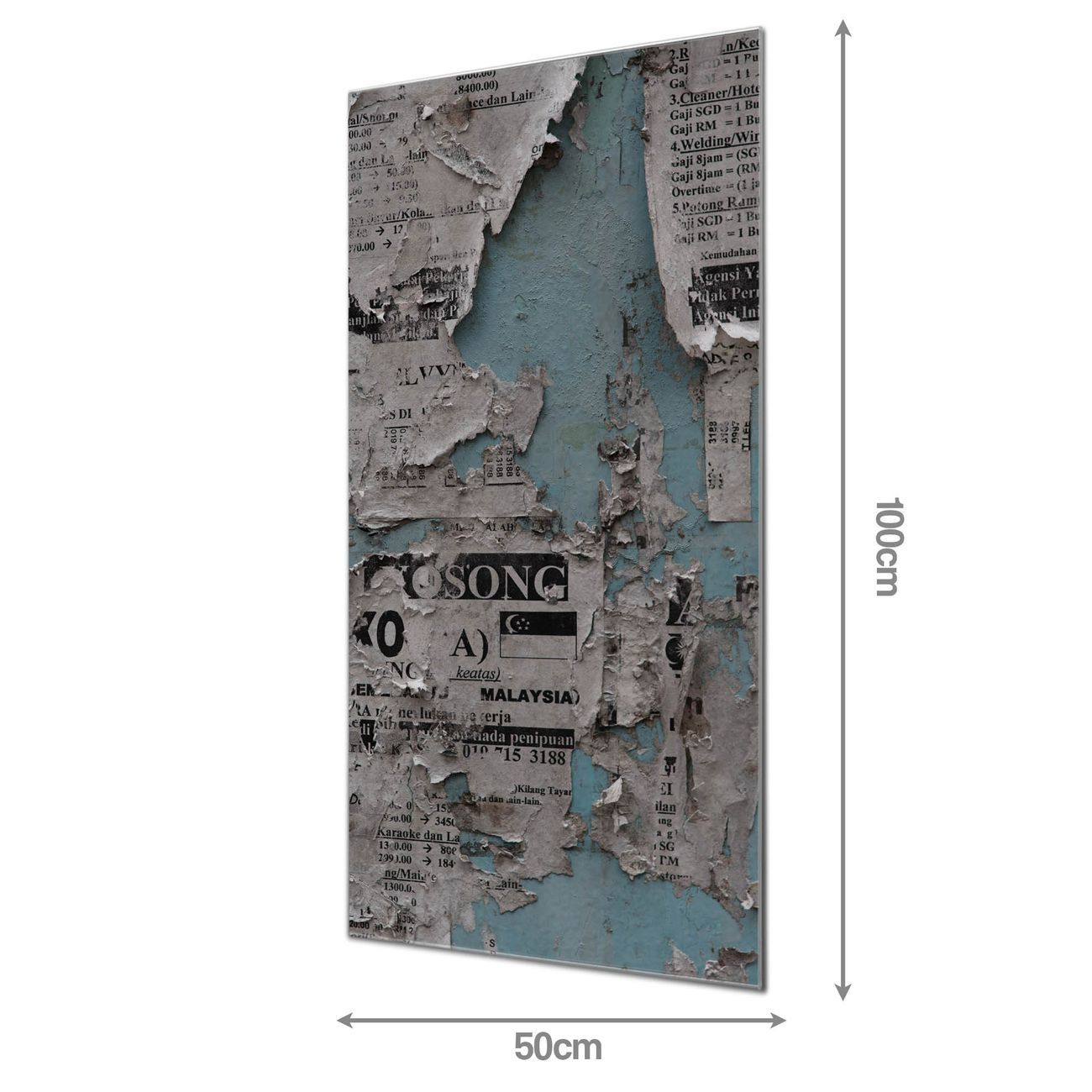 Material: 4mm Sicherheitsglas mit Metallrückwand Eigenschaften: beschreibbar, magnetisch, kratzfest Maße: 50x100x0,6cm, 7,50 kg schwer Motiv Nummer 10549 Wand mit Zeitungen Zubehör: inklusive 4 Neodym-Magnete