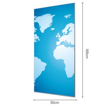 Material: 4mm Sicherheitsglas mit Metallrückwand Eigenschaften: beschreibbar, magnetisch, kratzfest Maße: 50x100x0,6cm, 7,50 kg schwer Motiv Nummer 10196 Weltkarte Zubehör: inklusive 4 Neodym-Magnete