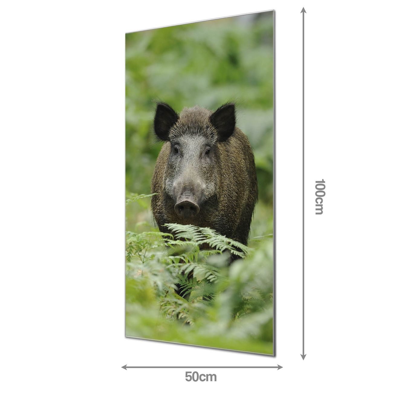Material: 4mm Sicherheitsglas mit Metallrückwand Eigenschaften: beschreibbar, magnetisch, kratzfest Maße: 50x100x0,6cm, 7,50 kg schwer Motiv Nummer 10495 Wildschwein Zubehör: inklusive 4 Neodym-Magnete