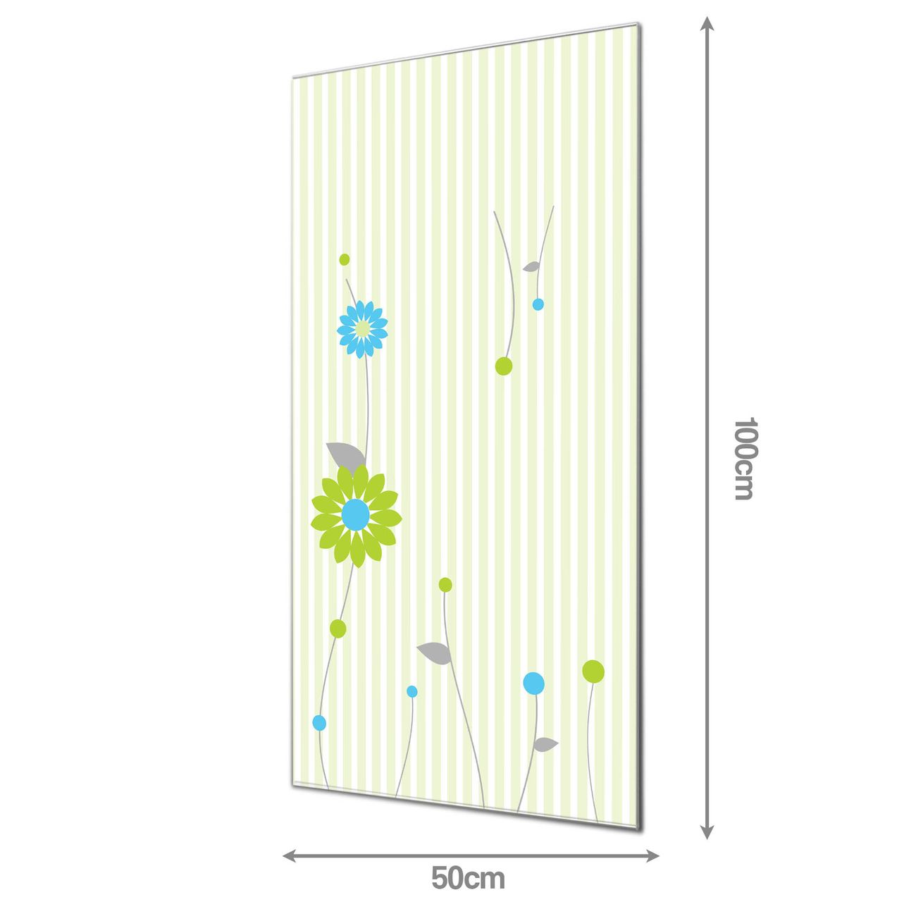 Material: 4mm Sicherheitsglas mit Metallrückwand Eigenschaften: beschreibbar, magnetisch, kratzfest Maße: 50x100x0,6cm, 7,50 kg schwer Motiv Nummer 10906 Zarte Blumen Zubehör: inklusive 4 Neodym-Magnete