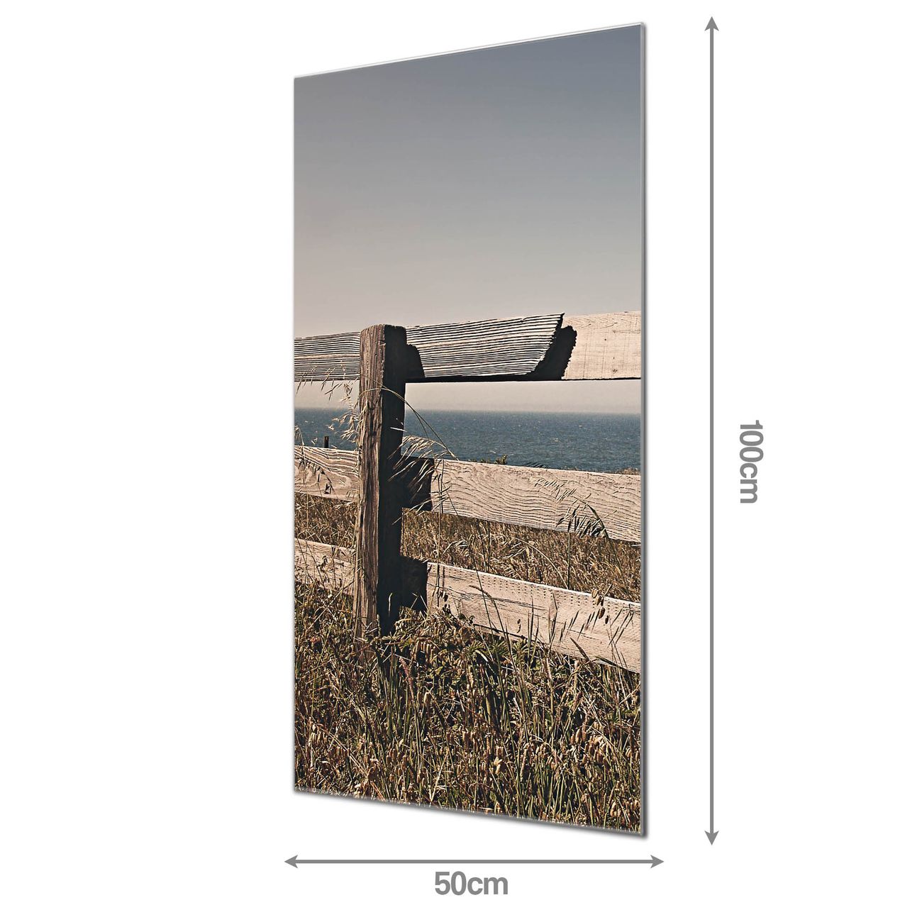 Material: 4mm Sicherheitsglas mit Metallrückwand Eigenschaften: beschreibbar, magnetisch, kratzfest Maße: 50x100x0,6cm, 7,50 kg schwer Motiv Nummer 11906 Zaun am Meer Zubehör: inklusive 4 Neodym-Magnete