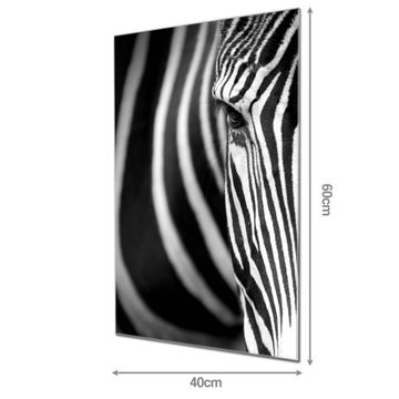 Material: 4mm Sicherheitsglas mit Metallrückwand Eigenschaften: beschreibbar, magnetisch, kratzfest Maße: 40x60x0,6cm, 3,60 kg schwer Motiv Nummer 12386 Zebra En Face Zubehör: inklusive 4 Neodym-Magnete