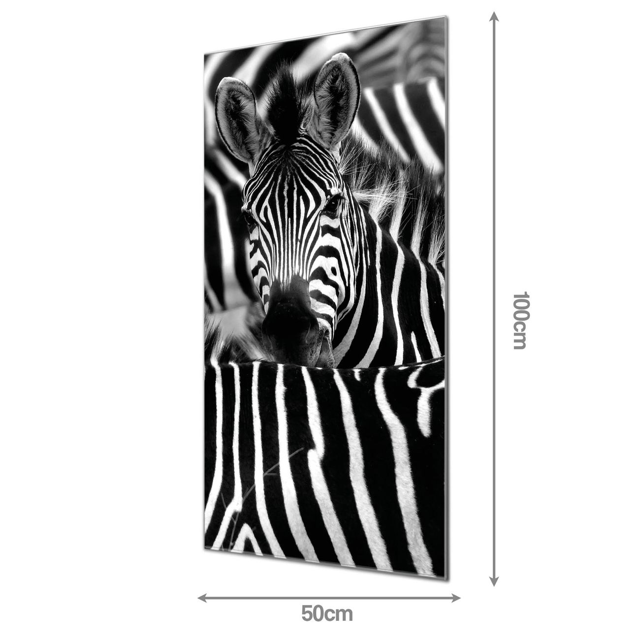 Material: 4mm Sicherheitsglas mit Metallrückwand Eigenschaften: beschreibbar, magnetisch, kratzfest Maße: 50x100x0,6cm, 7,50 kg schwer Motiv Nummer 11354 Zebras Zubehör: inklusive 4 Neodym-Magnete