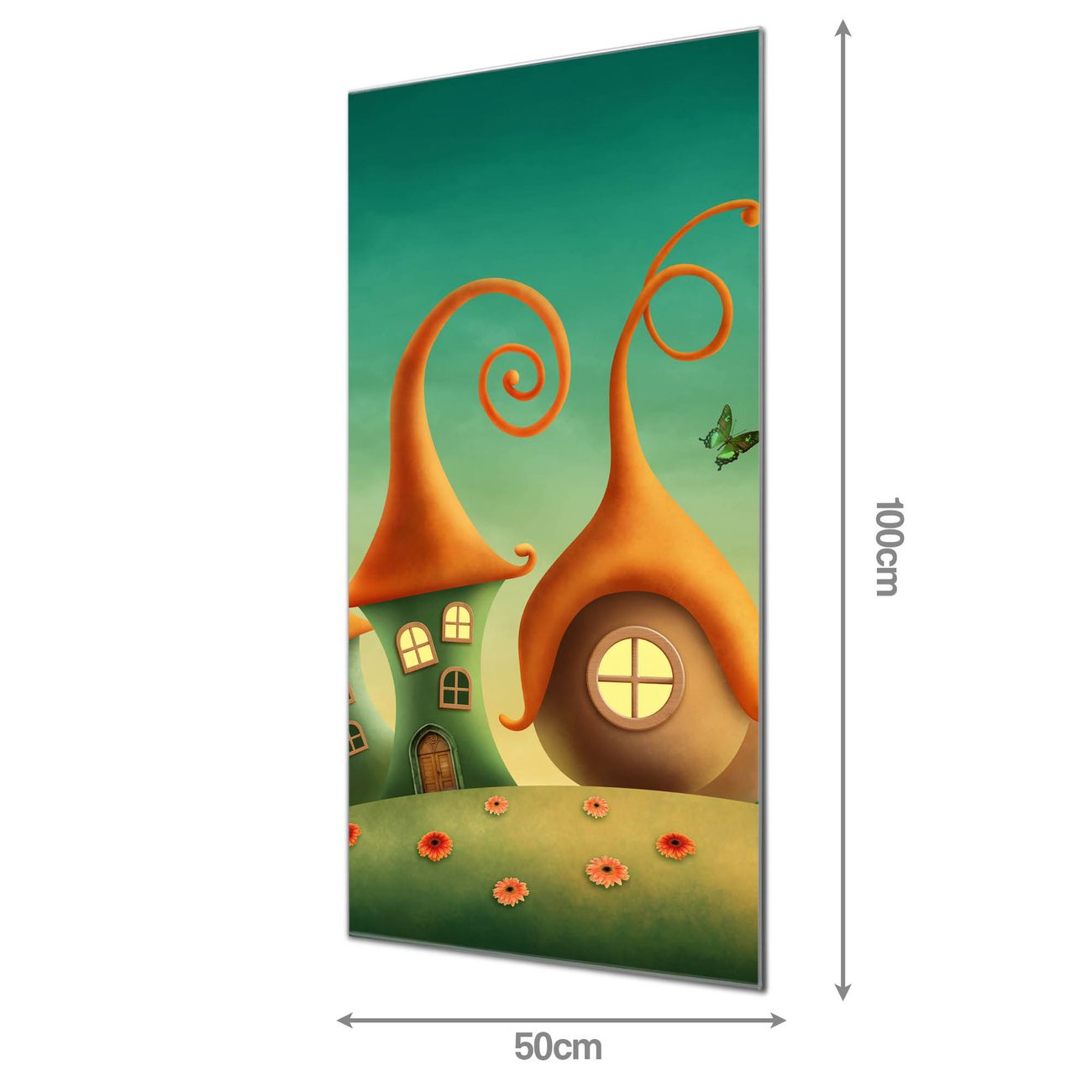 Material: 4mm Sicherheitsglas mit Metallrückwand Eigenschaften: beschreibbar, magnetisch, kratzfest Maße: 50x100x0,6cm, 7,50 kg schwer Motiv Nummer 11103 Zwergenhausen Zubehör: inklusive 4 Neodym-Magnete