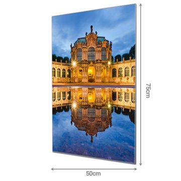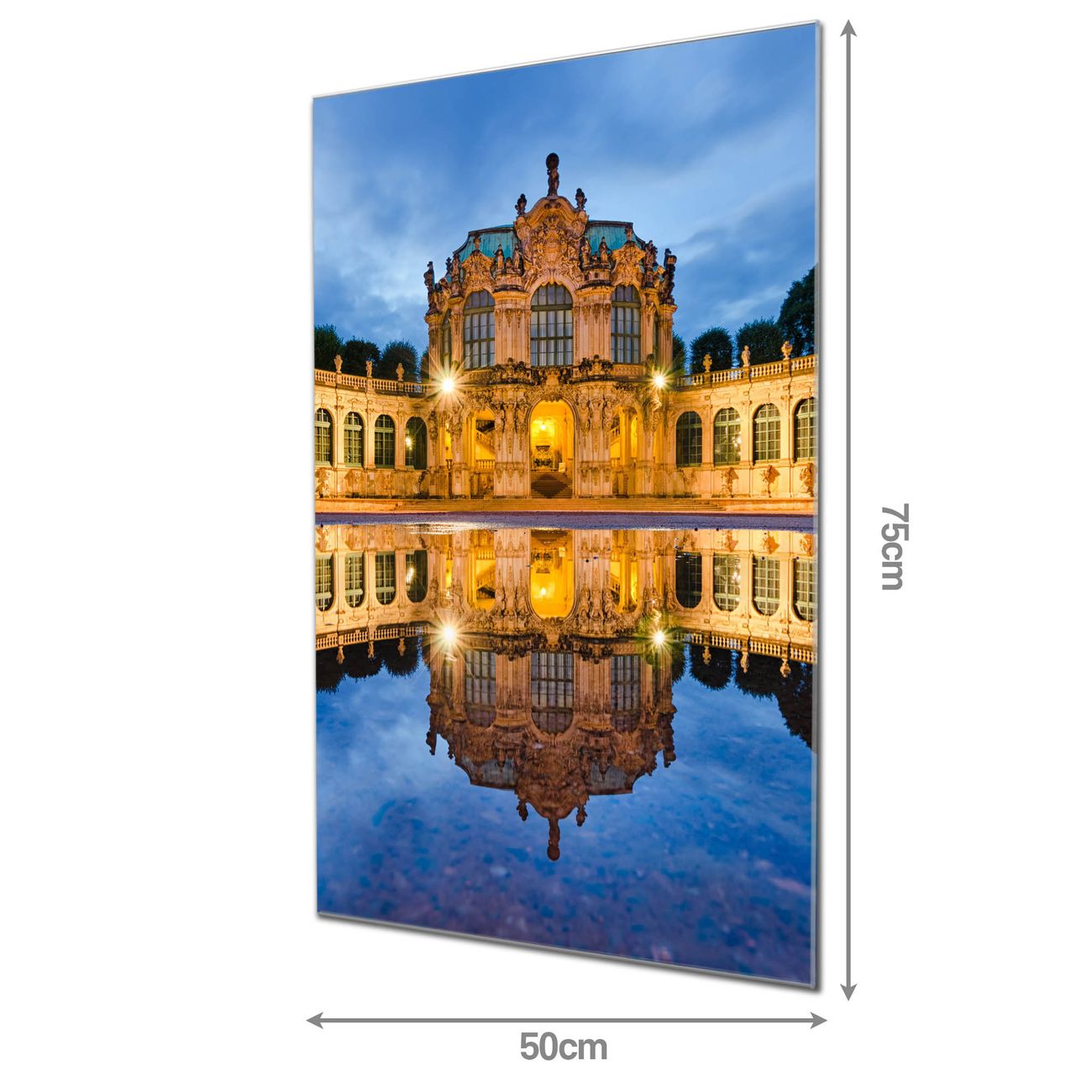 Material: 4mm Sicherheitsglas mit Metallrückwand Eigenschaften: beschreibbar, magnetisch, kratzfest Maße: 50x75x0,6cm, 5,63 kg schwer Motiv Nummer 12421 Zwinger Dresden Zubehör: inklusive 4 Neodym-Magnete