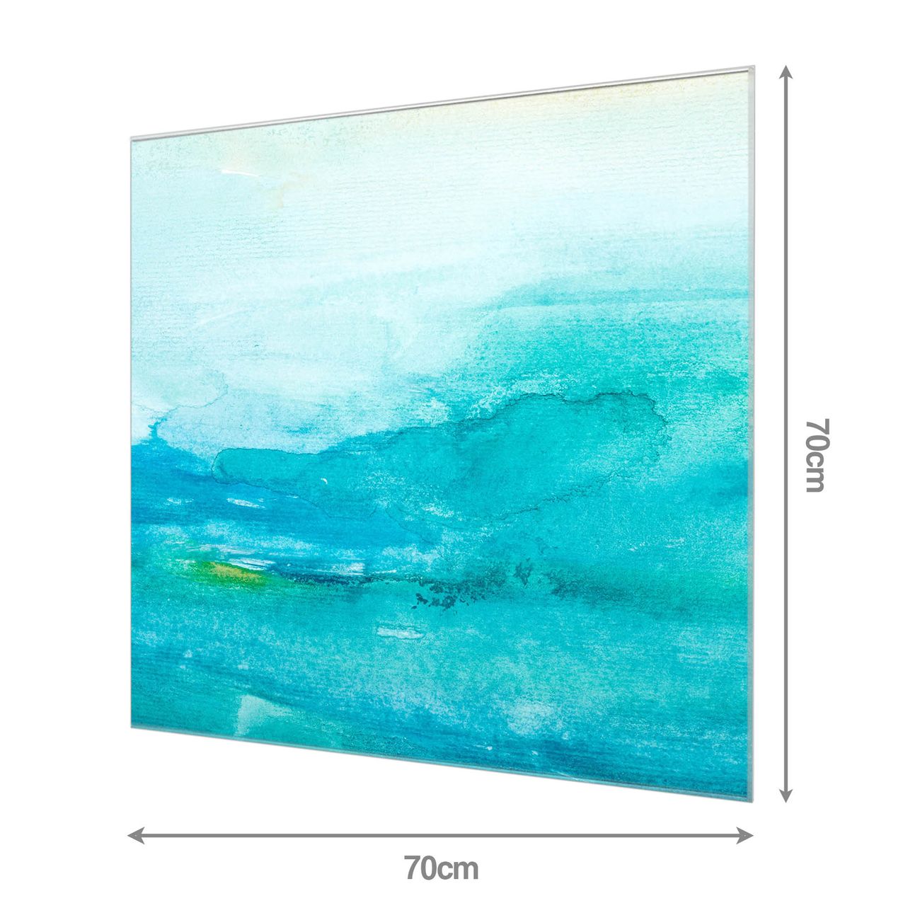 Material: 4mm Sicherheitsglas mit Metallrückwand Eigenschaften: beschreibbar, magnetisch, kratzfest Maße: 70x70x0,6cm, 10,50 kg schwer Motiv Nummer 10270 Aquarell Blau Zubehör: inklusive 4 Neodym-Magnete