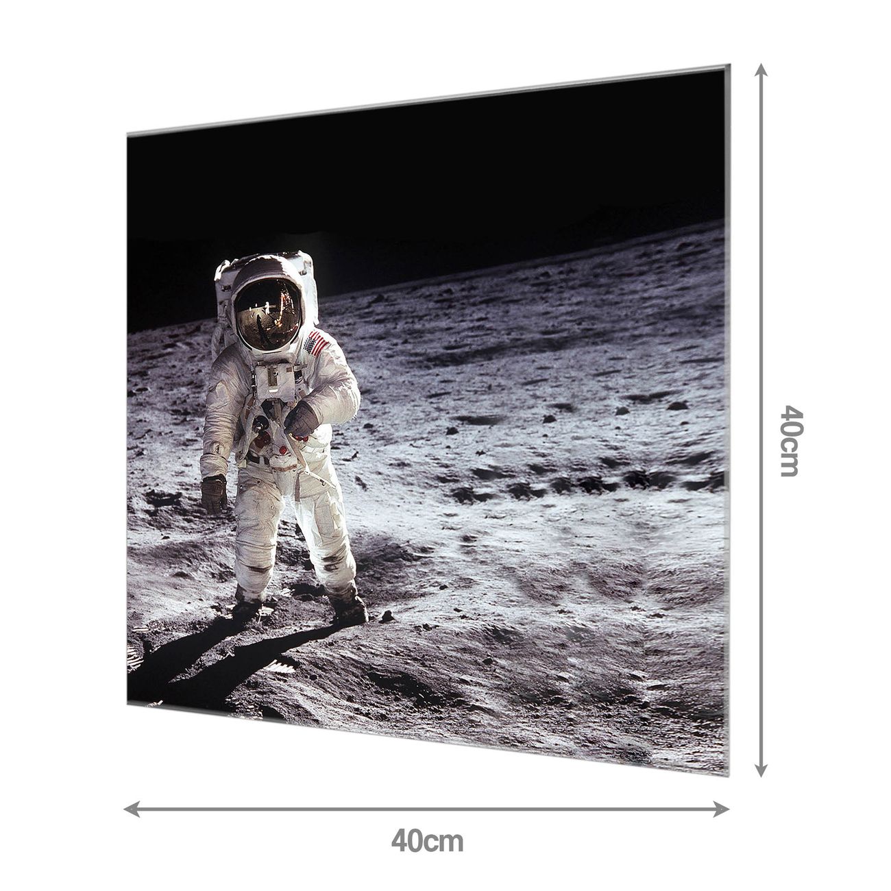 Material: 4mm Sicherheitsglas mit Metallrückwand Eigenschaften: beschreibbar, magnetisch, kratzfest Maße: 40x40x0,6cm, 3,36 kg schwer Motiv Nummer 10453 Astronaut Zubehör: inklusive 4 Neodym-Magnete