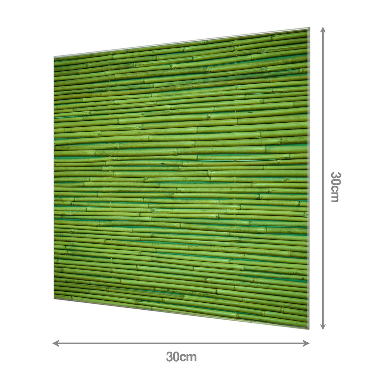 Material: 4mm Sicherheitsglas mit Metallrückwand Eigenschaften: beschreibbar, magnetisch, kratzfest Maße: 30x30x0,6cm, 1,89 kg schwer Motiv Nummer 10353 Bambus Grün Zubehör: inklusive 4 Neodym-Magnete