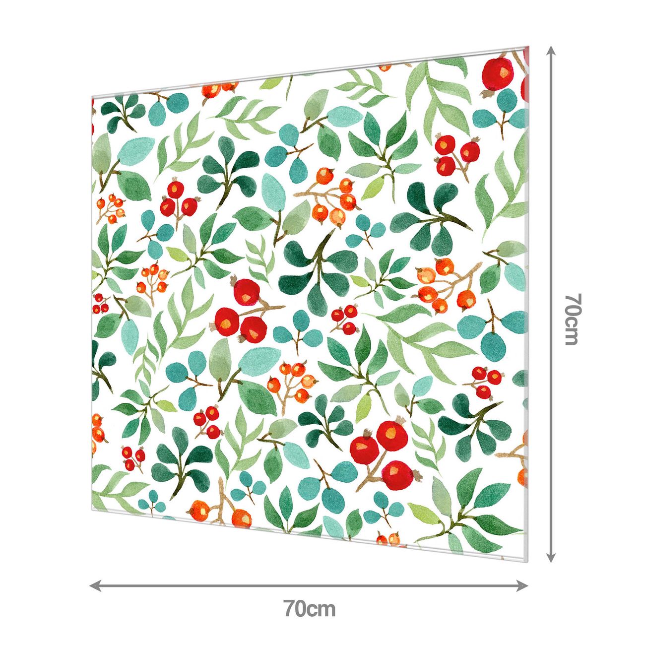Material: 4mm Sicherheitsglas mit Metallrückwand Eigenschaften: beschreibbar, magnetisch, kratzfest Maße: 70x70x0,6cm, 10,50 kg schwer Motiv Nummer 12605 Beeren und Blätter Zubehör: inklusive 4 Neodym-Magnete