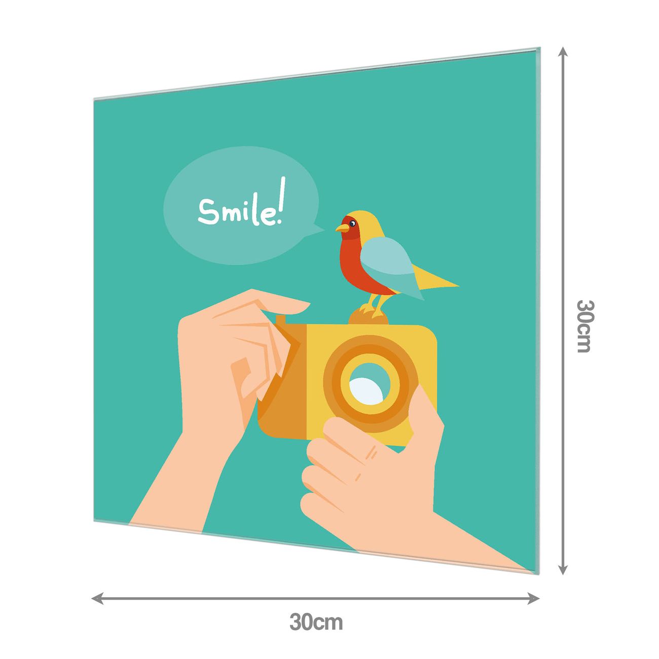 Material: 4mm Sicherheitsglas mit Metallrückwand Eigenschaften: beschreibbar, magnetisch, kratzfest Maße: 30x30x0,6cm, 1,89 kg schwer Motiv Nummer 12454 Bitte Lächeln 2 Zubehör: inklusive 4 Neodym-Magnete