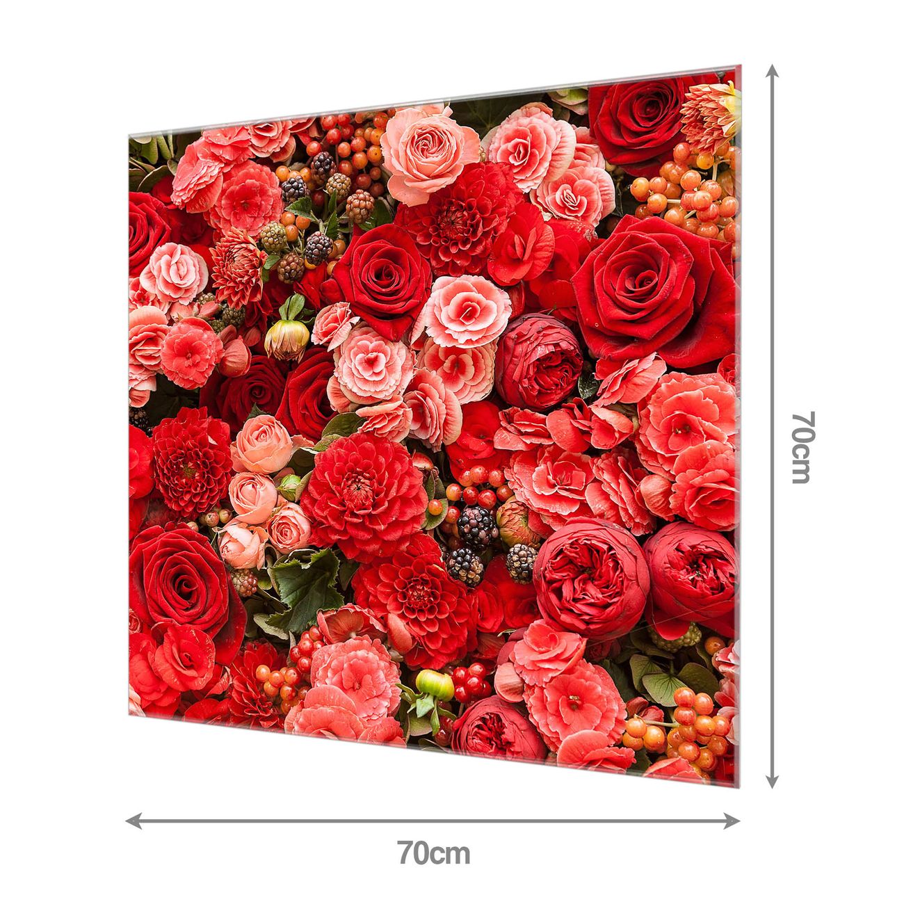 Material: 4mm Sicherheitsglas mit Metallrückwand Eigenschaften: beschreibbar, magnetisch, kratzfest Maße: 70x70x0,6cm, 10,50 kg schwer Motiv Nummer 11399 Bouquet in Rot Zubehör: inklusive 4 Neodym-Magnete