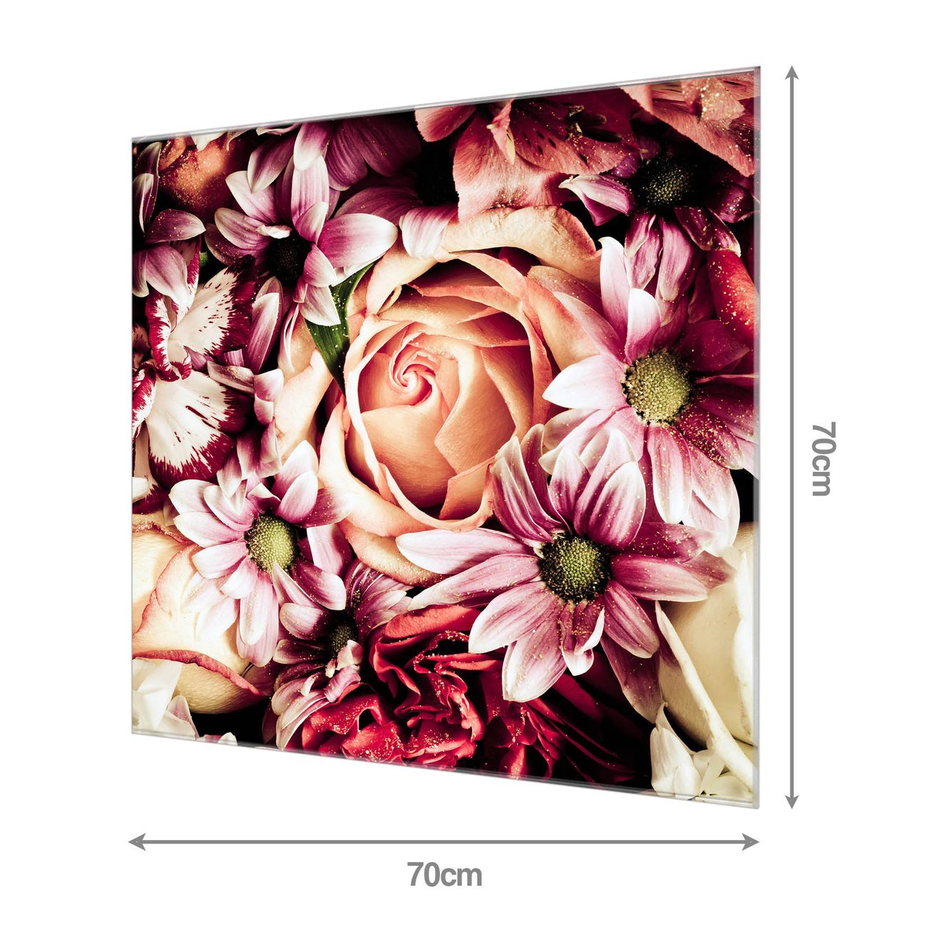 Material: 4mm Sicherheitsglas mit Metallrückwand Eigenschaften: beschreibbar, magnetisch, kratzfest Maße: 70x70x0,6cm, 10,50 kg schwer Motiv Nummer 12786 Brautstrauss Zubehör: inklusive 4 Neodym-Magnete