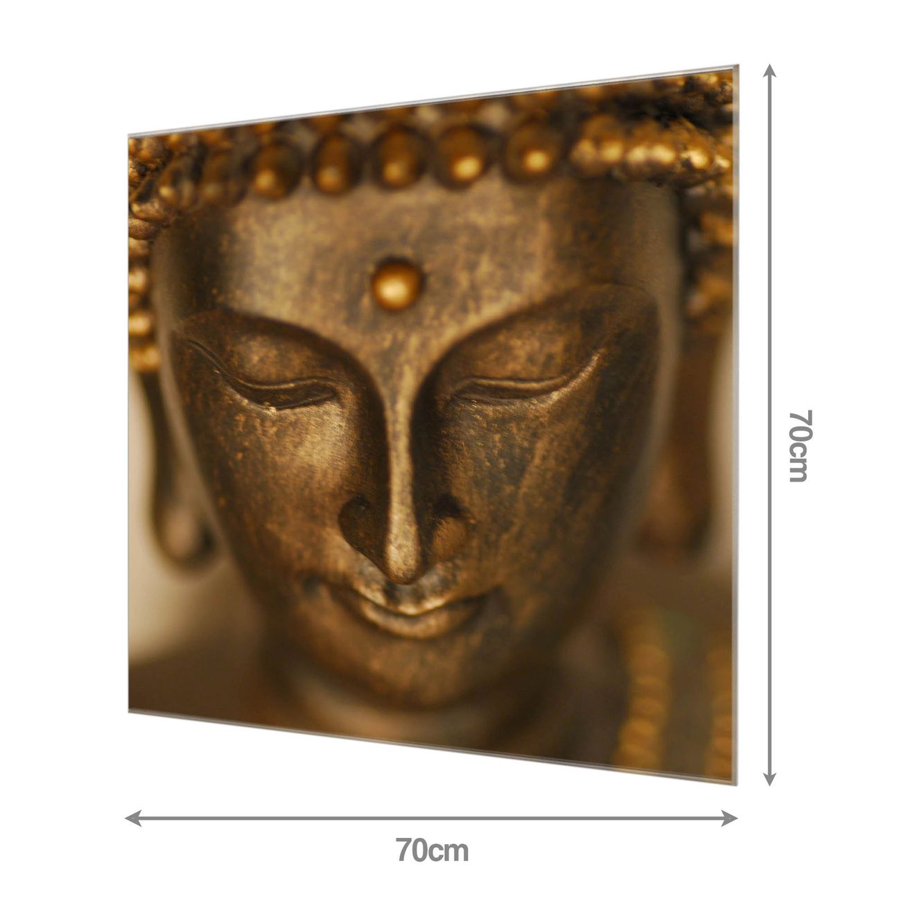 Material: 4mm Sicherheitsglas mit Metallrückwand Eigenschaften: beschreibbar, magnetisch, kratzfest Maße: 70x70x0,6cm, 10,50 kg schwer Motiv Nummer 10087 Buddha Gold Zubehör: inklusive 4 Neodym-Magnete