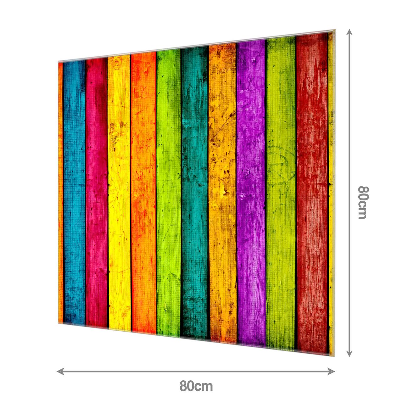 Material: 4mm Sicherheitsglas mit Metallrückwand Eigenschaften: beschreibbar, magnetisch, kratzfest Maße: 80x80x0,6cm, 12,00 kg schwer Motiv Nummer 10620 Bunte Holzlatten Zubehör: inklusive 4 Neodym-Magnete