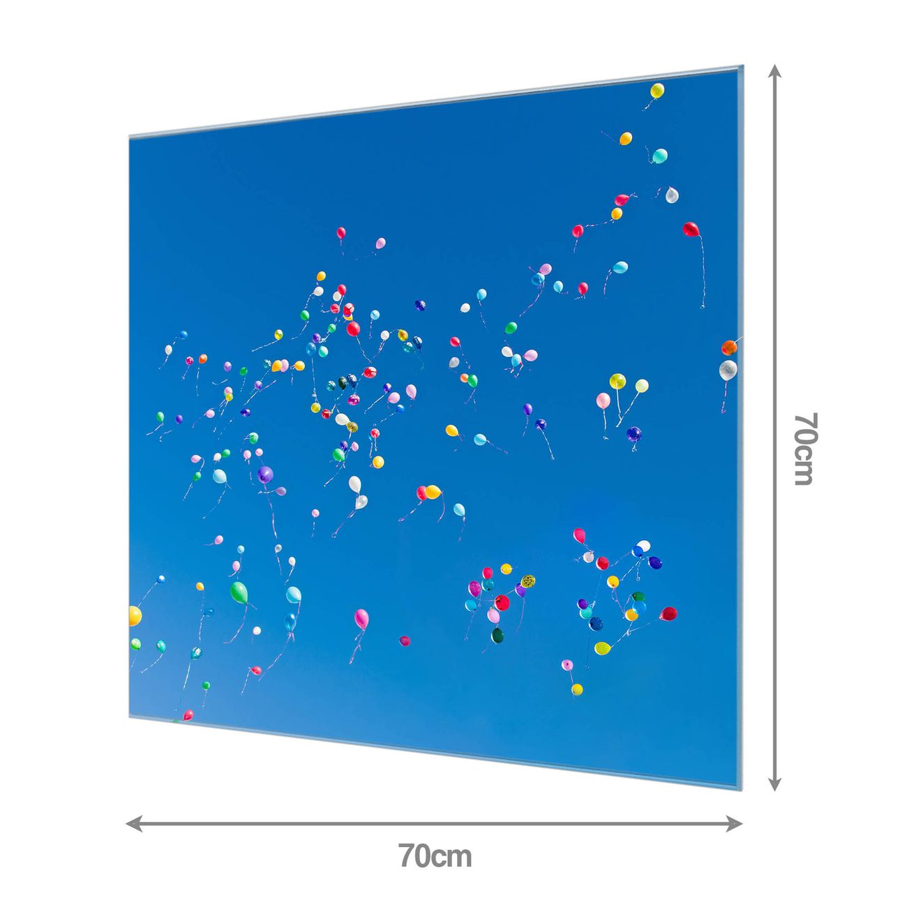 Material: 4mm Sicherheitsglas mit Metallrückwand Eigenschaften: beschreibbar, magnetisch, kratzfest Maße: 70x70x0,6cm, 10,50 kg schwer Motiv Nummer 12505 Bunte Luftballons Zubehör: inklusive 4 Neodym-Magnete