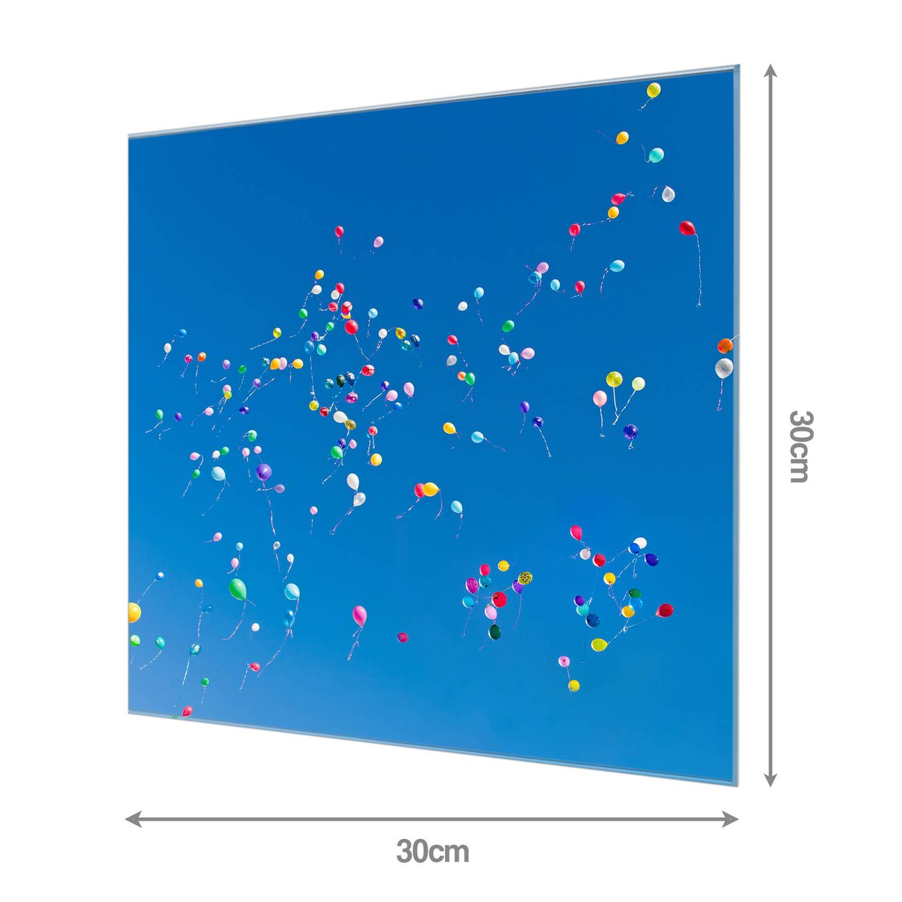 Material: 4mm Sicherheitsglas mit Metallrückwand Eigenschaften: beschreibbar, magnetisch, kratzfest Maße: 30x30x0,6cm, 1,89 kg schwer Motiv Nummer 12505 Bunte Luftballons Zubehör: inklusive 4 Neodym-Magnete