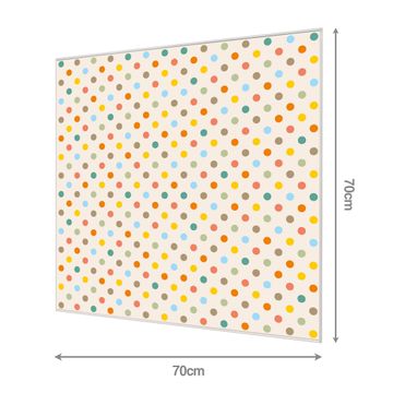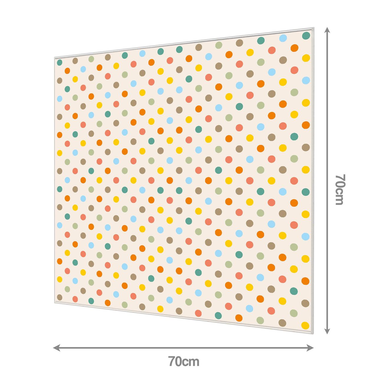 Material: 4mm Sicherheitsglas mit Metallrückwand Eigenschaften: beschreibbar, magnetisch, kratzfest Maße: 70x70x0,6cm, 10,50 kg schwer Motiv Nummer 11360 Bunte Punkte Zubehör: inklusive 4 Neodym-Magnete