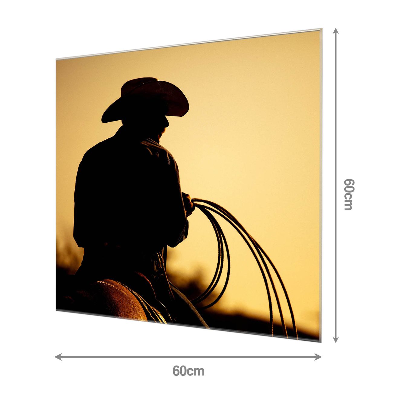 Material: 4mm Sicherheitsglas mit Metallrückwand Eigenschaften: beschreibbar, magnetisch, kratzfest Maße: 60x60x0,6cm, 7,56 kg schwer Motiv Nummer 10295 Cowboy Zubehör: inklusive 4 Neodym-Magnete