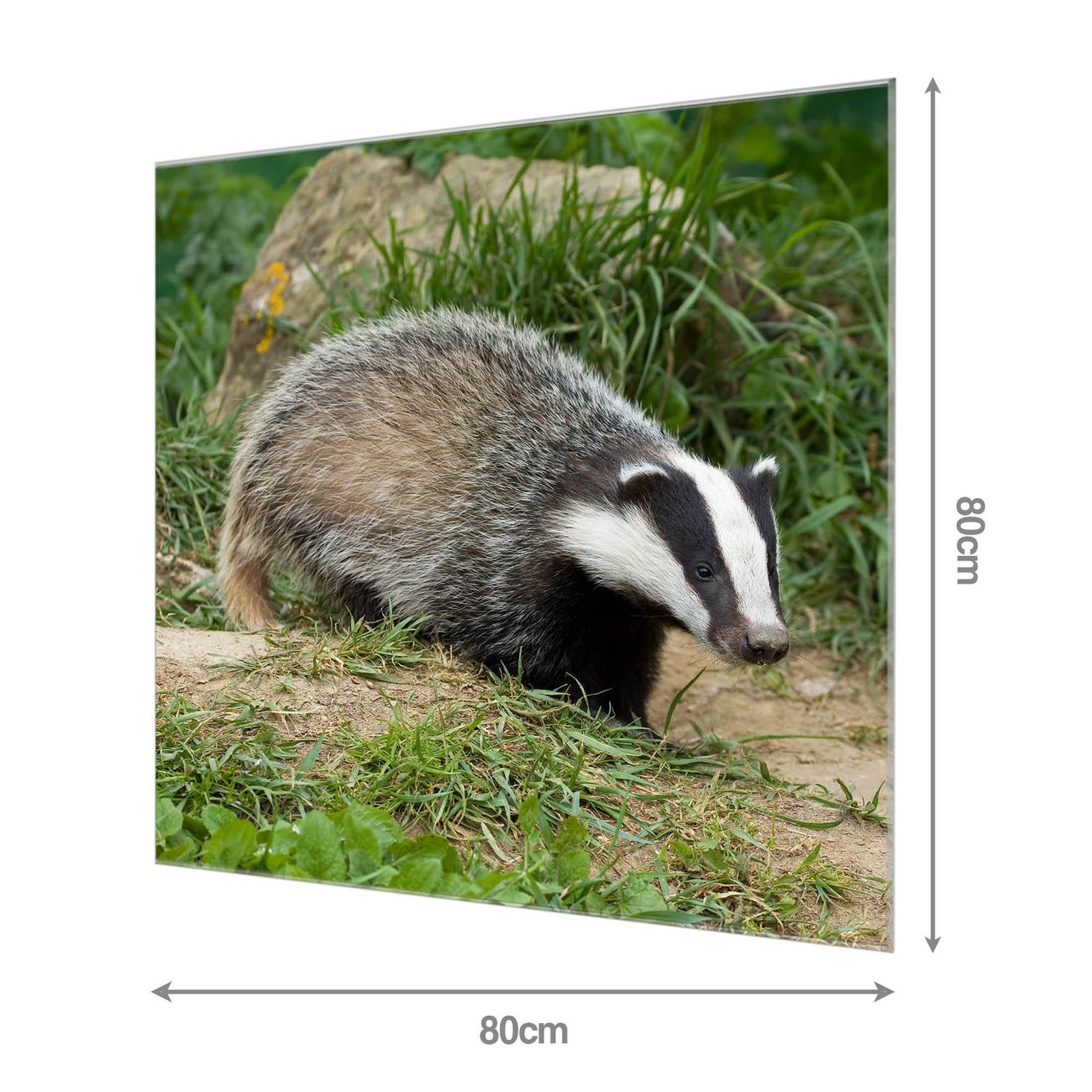 Material: 4mm Sicherheitsglas mit Metallrückwand Eigenschaften: beschreibbar, magnetisch, kratzfest Maße: 80x80x0,6cm, 12,00 kg schwer Motiv Nummer 10486 Dachs Zubehör: inklusive 4 Neodym-Magnete