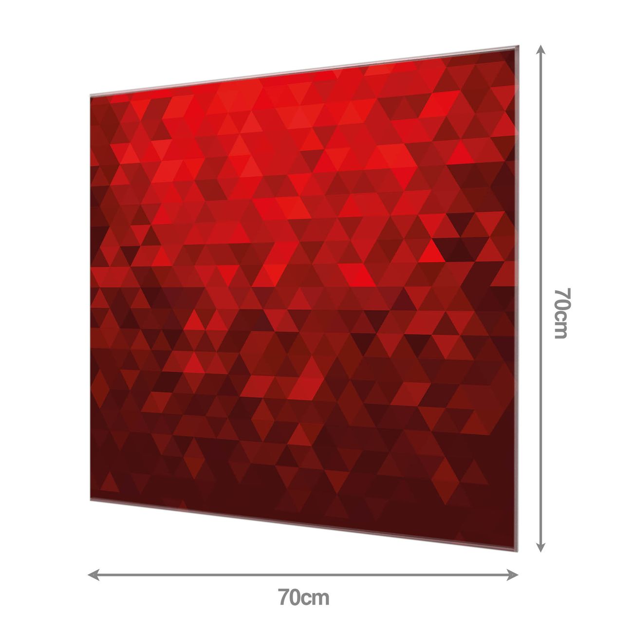 Material: 4mm Sicherheitsglas mit Metallrückwand Eigenschaften: beschreibbar, magnetisch, kratzfest Maße: 70x70x0,6cm, 10,50 kg schwer Motiv Nummer 10949 Dreiecke Rot Zubehör: inklusive 4 Neodym-Magnete