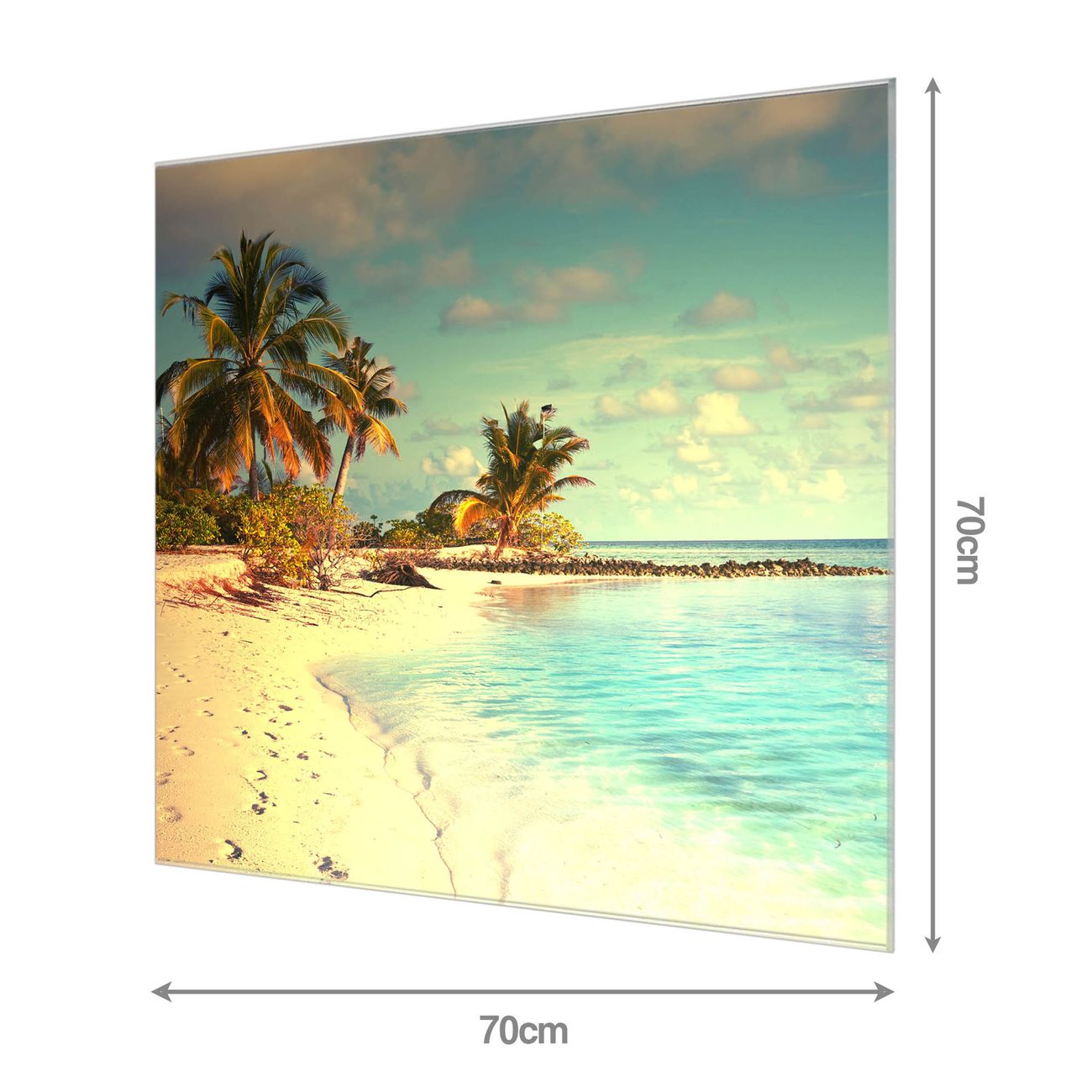 Material: 4mm Sicherheitsglas mit Metallrückwand Eigenschaften: beschreibbar, magnetisch, kratzfest Maße: 70x70x0,6cm, 10,50 kg schwer Motiv Nummer 11723 Einsame Insel Zubehör: inklusive 4 Neodym-Magnete