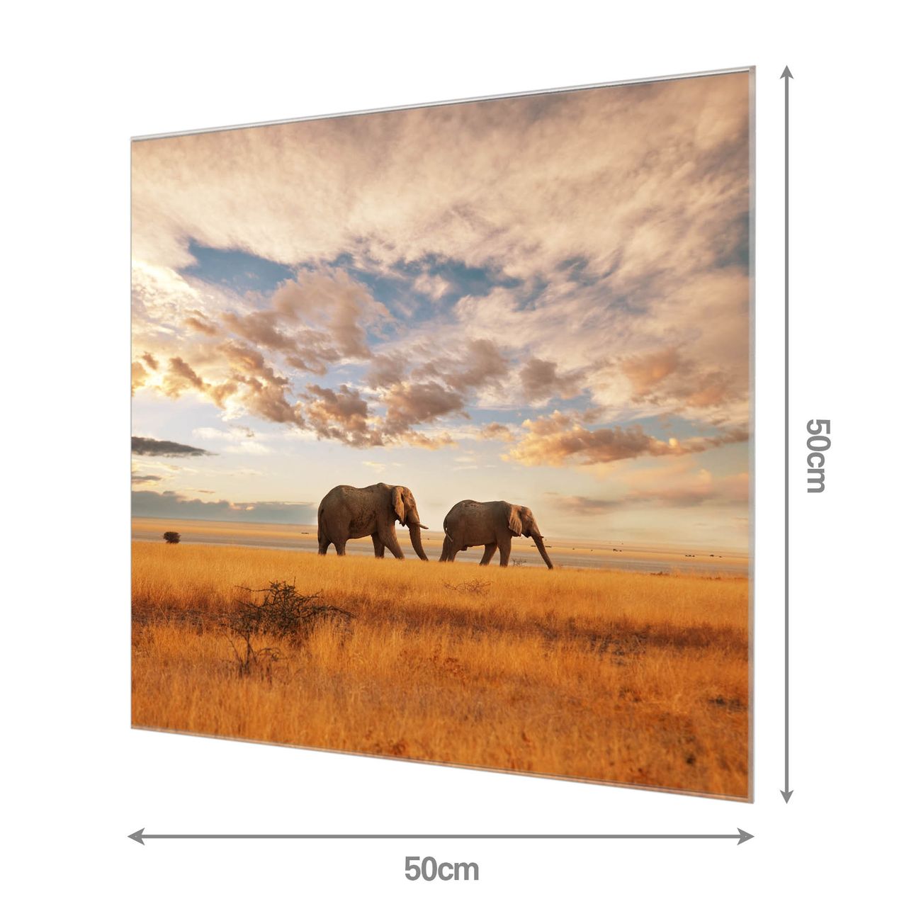 Material: 4mm Sicherheitsglas mit Metallrückwand Eigenschaften: beschreibbar, magnetisch, kratzfest Maße: 50x50x0,6cm, 5,25 kg schwer Motiv Nummer 10488 Elefanten Zubehör: inklusive 4 Neodym-Magnete