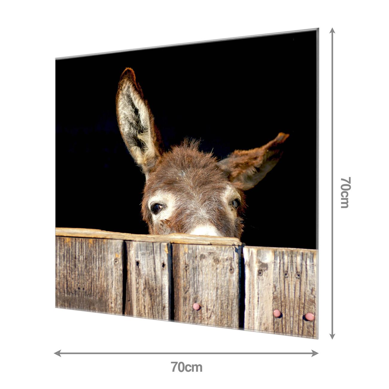 Material: 4mm Sicherheitsglas mit Metallrückwand Eigenschaften: beschreibbar, magnetisch, kratzfest Maße: 70x70x0,6cm, 10,50 kg schwer Motiv Nummer 10472 Esel Zubehör: inklusive 4 Neodym-Magnete