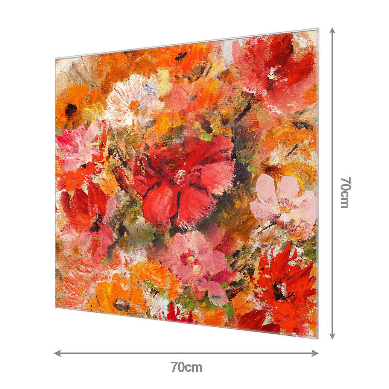 Material: 4mm Sicherheitsglas mit Metallrückwand Eigenschaften: beschreibbar, magnetisch, kratzfest Maße: 70x70x0,6cm, 10,50 kg schwer Motiv Nummer 12351 Fallende Blumen Zubehör: inklusive 4 Neodym-Magnete