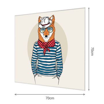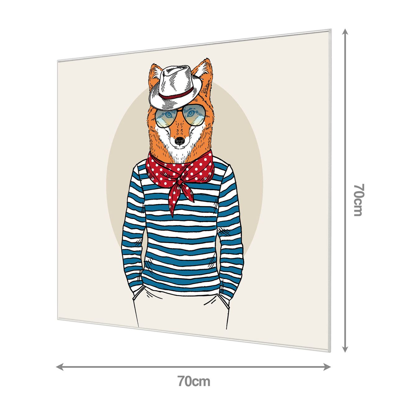 Material: 4mm Sicherheitsglas mit Metallrückwand Eigenschaften: beschreibbar, magnetisch, kratzfest Maße: 70x70x0,6cm, 10,50 kg schwer Motiv Nummer 12122 Fancy Fox Zubehör: inklusive 4 Neodym-Magnete