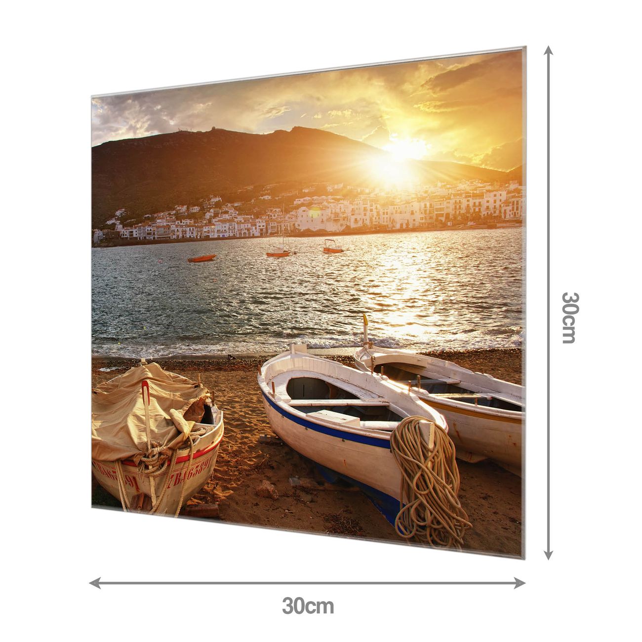 Material: 4mm Sicherheitsglas mit Metallrückwand Eigenschaften: beschreibbar, magnetisch, kratzfest Maße: 30x30x0,6cm, 1,89 kg schwer Motiv Nummer 10557 Fischerboote Zubehör: inklusive 4 Neodym-Magnete