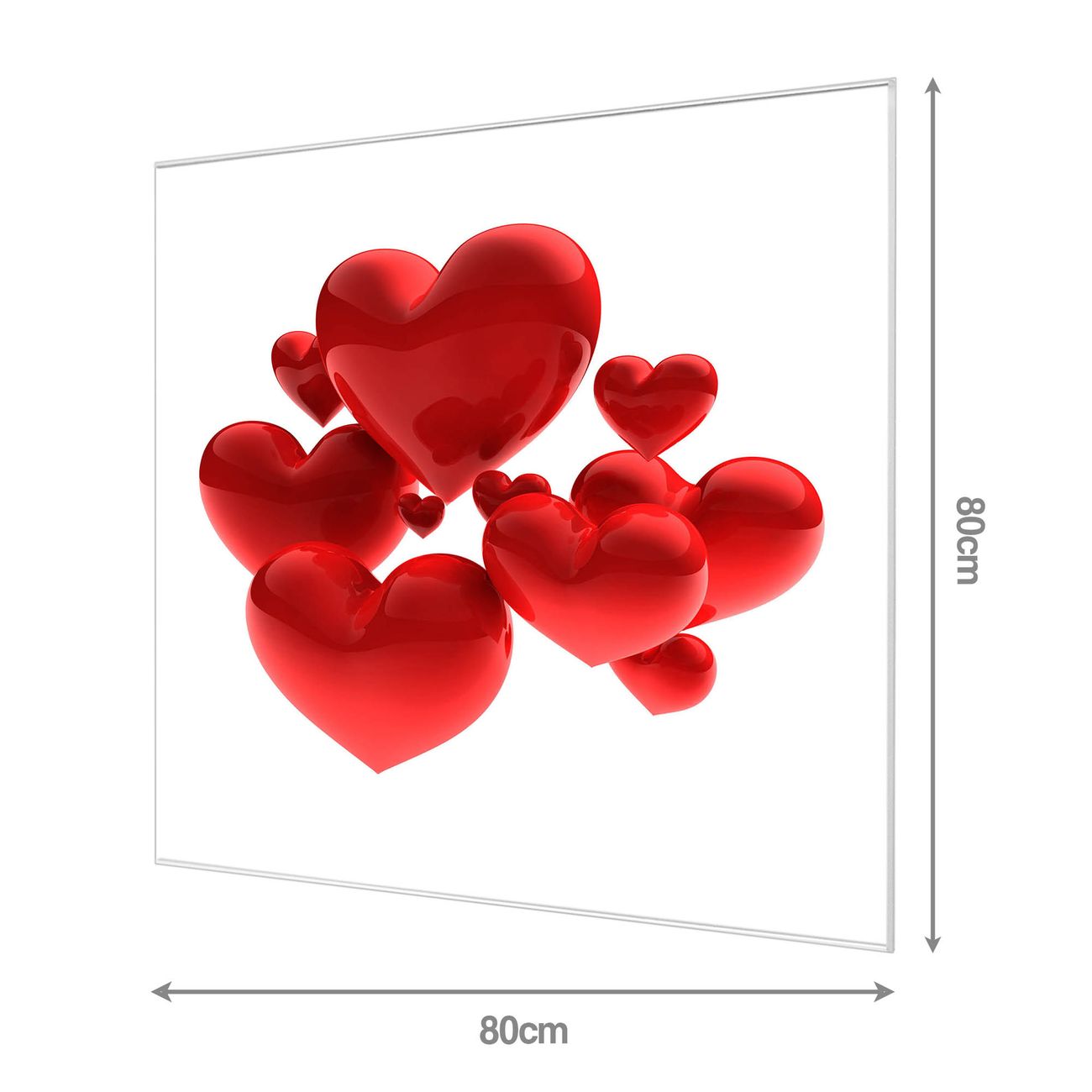 Material: 4mm Sicherheitsglas mit Metallrückwand Eigenschaften: beschreibbar, magnetisch, kratzfest Maße: 80x80x0,6cm, 12,00 kg schwer Motiv Nummer 10228 Fliegende Herzen Zubehör: inklusive 4 Neodym-Magnete