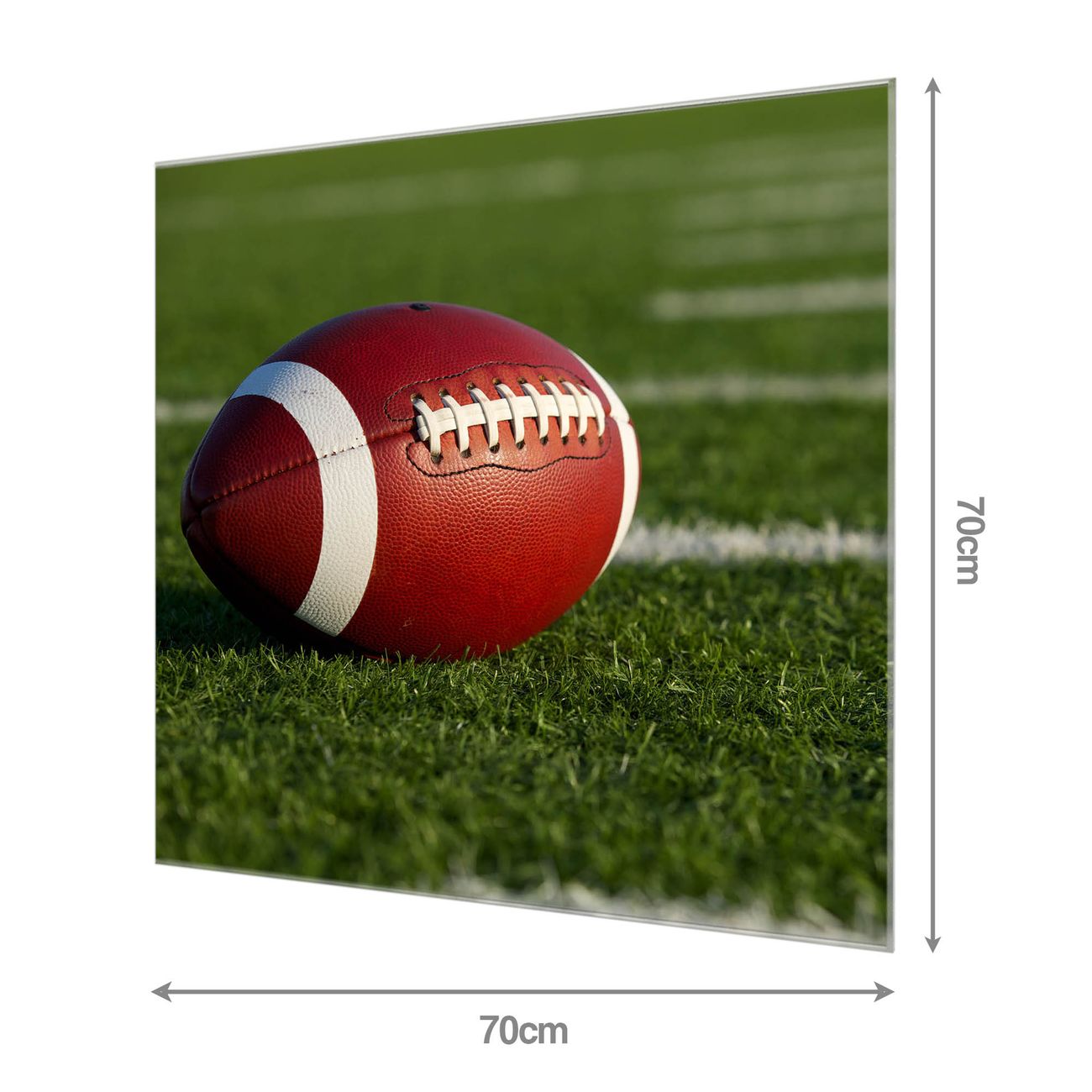 Material: 4mm Sicherheitsglas mit Metallrückwand Eigenschaften: beschreibbar, magnetisch, kratzfest Maße: 70x70x0,6cm, 10,50 kg schwer Motiv Nummer 12749 Football Zubehör: inklusive 4 Neodym-Magnete