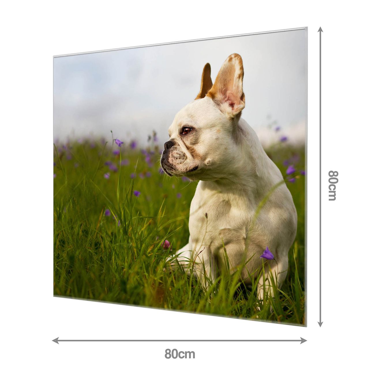 Material: 4mm Sicherheitsglas mit Metallrückwand Eigenschaften: beschreibbar, magnetisch, kratzfest Maße: 80x80x0,6cm, 12,00 kg schwer Motiv Nummer 10511 Französische Bulldogge Zubehör: inklusive 4 Neodym-Magnete