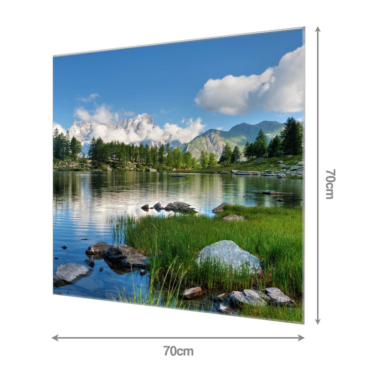 Material: 4mm Sicherheitsglas mit Metallrückwand Eigenschaften: beschreibbar, magnetisch, kratzfest Maße: 70x70x0,6cm, 10,50 kg schwer Motiv Nummer 12262 Gebirgssee Zubehör: inklusive 4 Neodym-Magnete