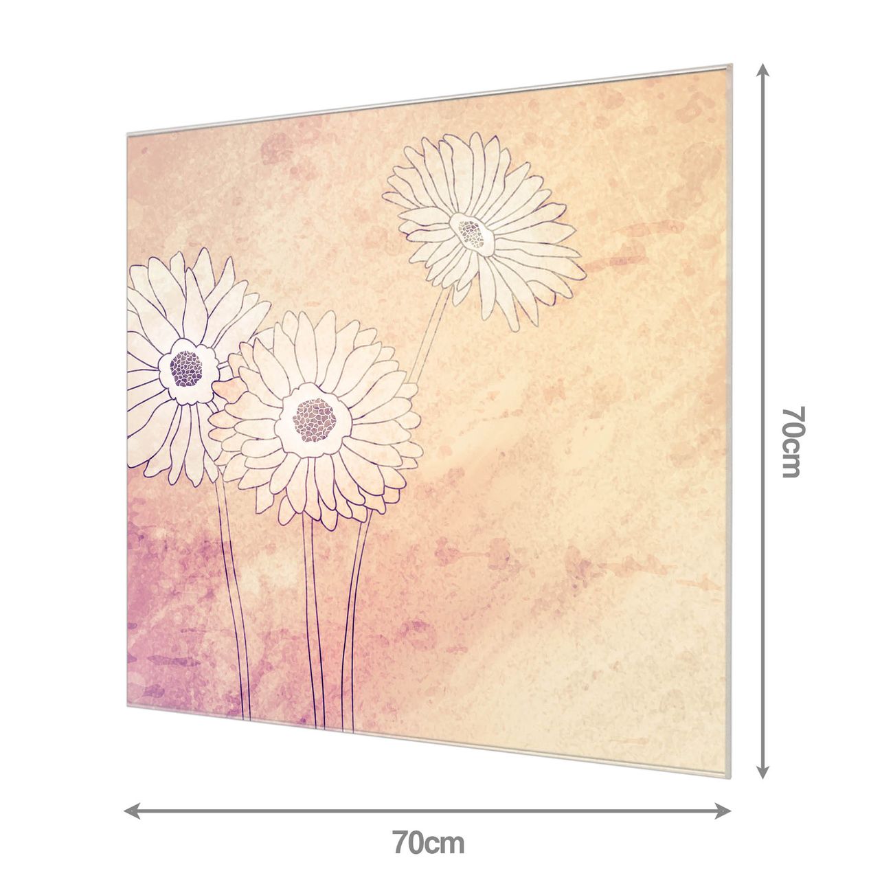 Material: 4mm Sicherheitsglas mit Metallrückwand Eigenschaften: beschreibbar, magnetisch, kratzfest Maße: 70x70x0,6cm, 10,50 kg schwer Motiv Nummer 10363 Gerbera Zubehör: inklusive 4 Neodym-Magnete