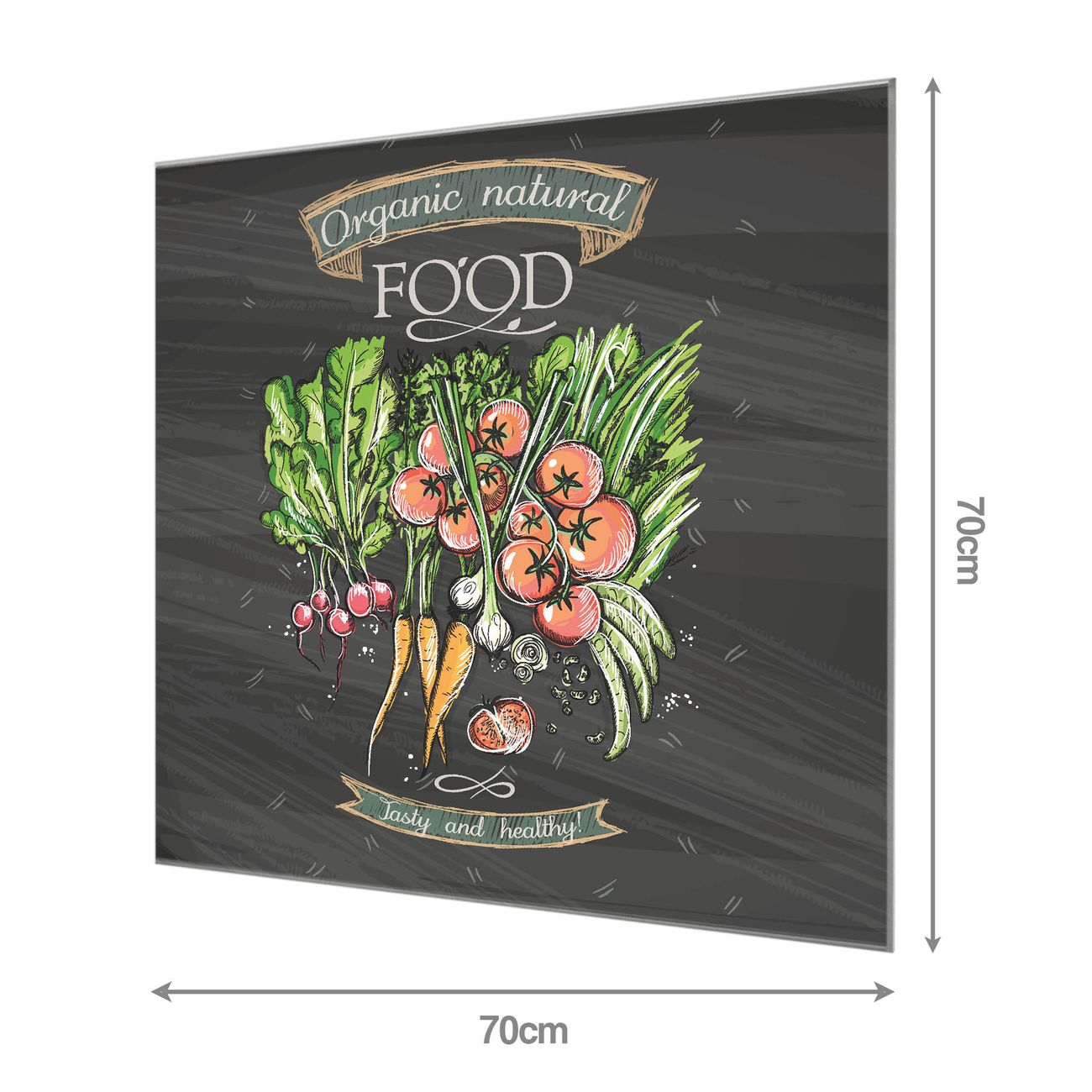 Material: 4mm Sicherheitsglas mit Metallrückwand Eigenschaften: beschreibbar, magnetisch, kratzfest Maße: 70x70x0,6cm, 10,50 kg schwer Motiv Nummer 10983 Gesund Und Lecker Zubehör: inklusive 4 Neodym-Magnete