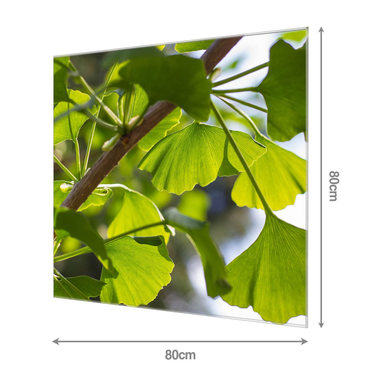 Material: 4mm Sicherheitsglas mit Metallrückwand Eigenschaften: beschreibbar, magnetisch, kratzfest Maße: 80x80x0,6cm, 12,00 kg schwer Motiv Nummer 10537 Gingko Zubehör: inklusive 4 Neodym-Magnete