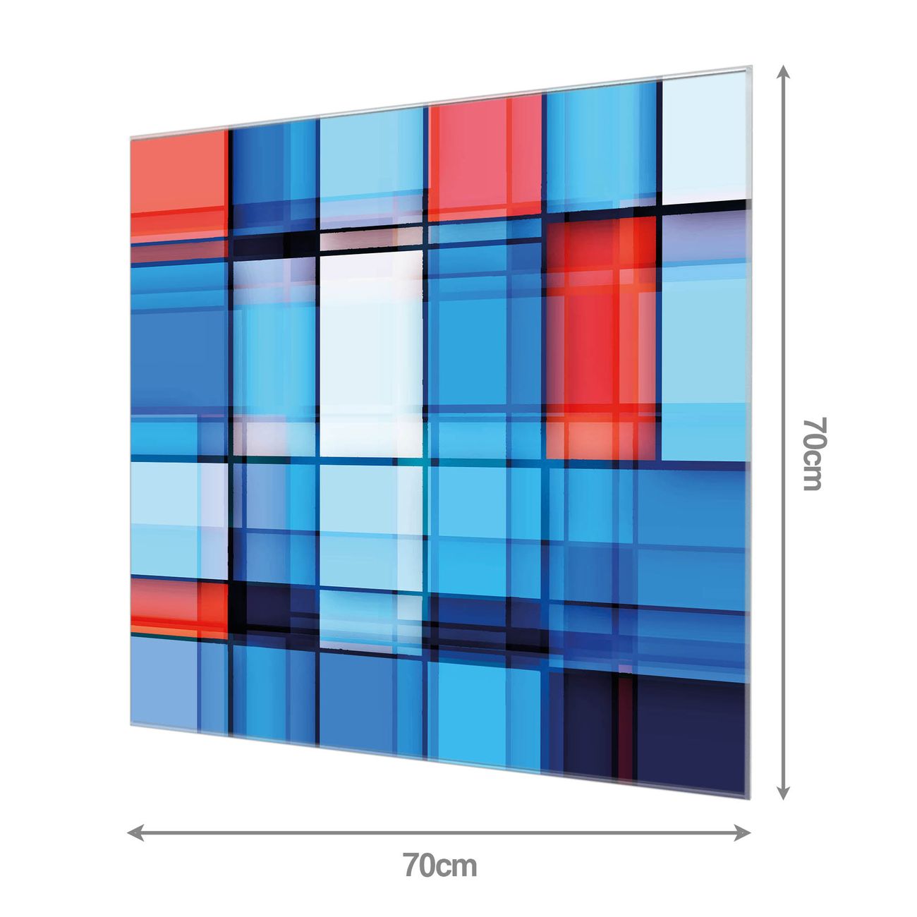 Material: 4mm Sicherheitsglas mit Metallrückwand Eigenschaften: beschreibbar, magnetisch, kratzfest Maße: 70x70x0,6cm, 10,50 kg schwer Motiv Nummer 12161 Gläserne Stadt Zubehör: inklusive 4 Neodym-Magnete