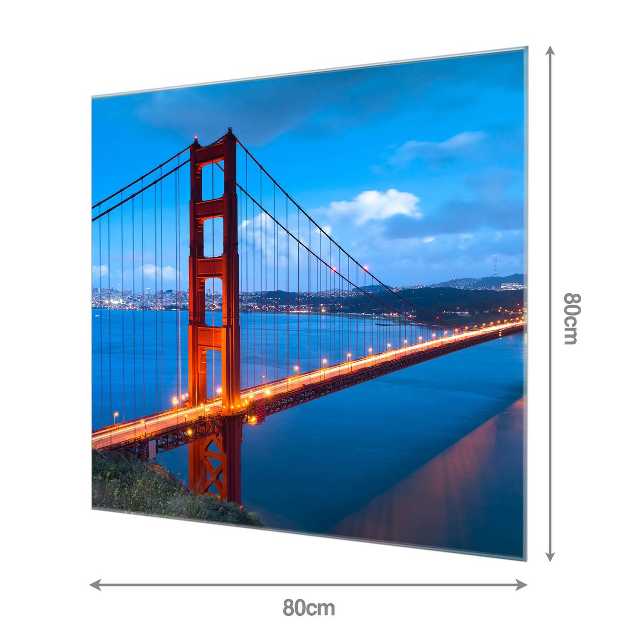 Material: 4mm Sicherheitsglas mit Metallrückwand Eigenschaften: beschreibbar, magnetisch, kratzfest Maße: 80x80x0,6cm, 12,00 kg schwer Motiv Nummer 10241 Golden Gate Bridge Zubehör: inklusive 4 Neodym-Magnete