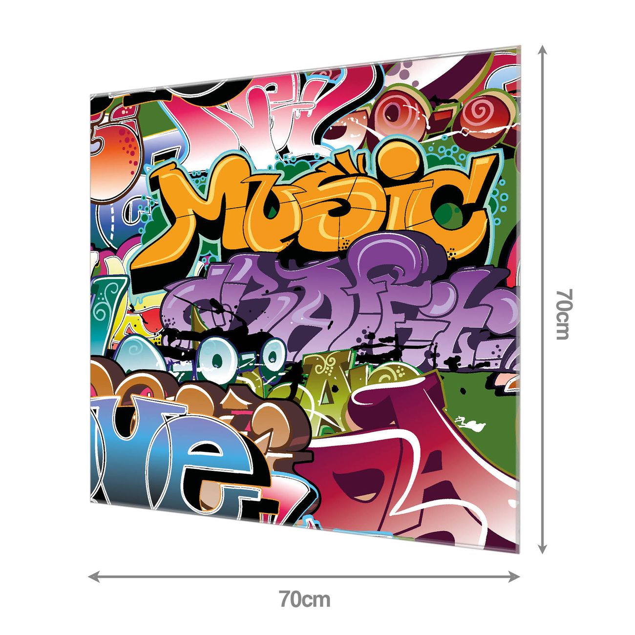Material: 4mm Sicherheitsglas mit Metallrückwand Eigenschaften: beschreibbar, magnetisch, kratzfest Maße: 70x70x0,6cm, 10,50 kg schwer Motiv Nummer 10203 Graffiti Zubehör: inklusive 4 Neodym-Magnete