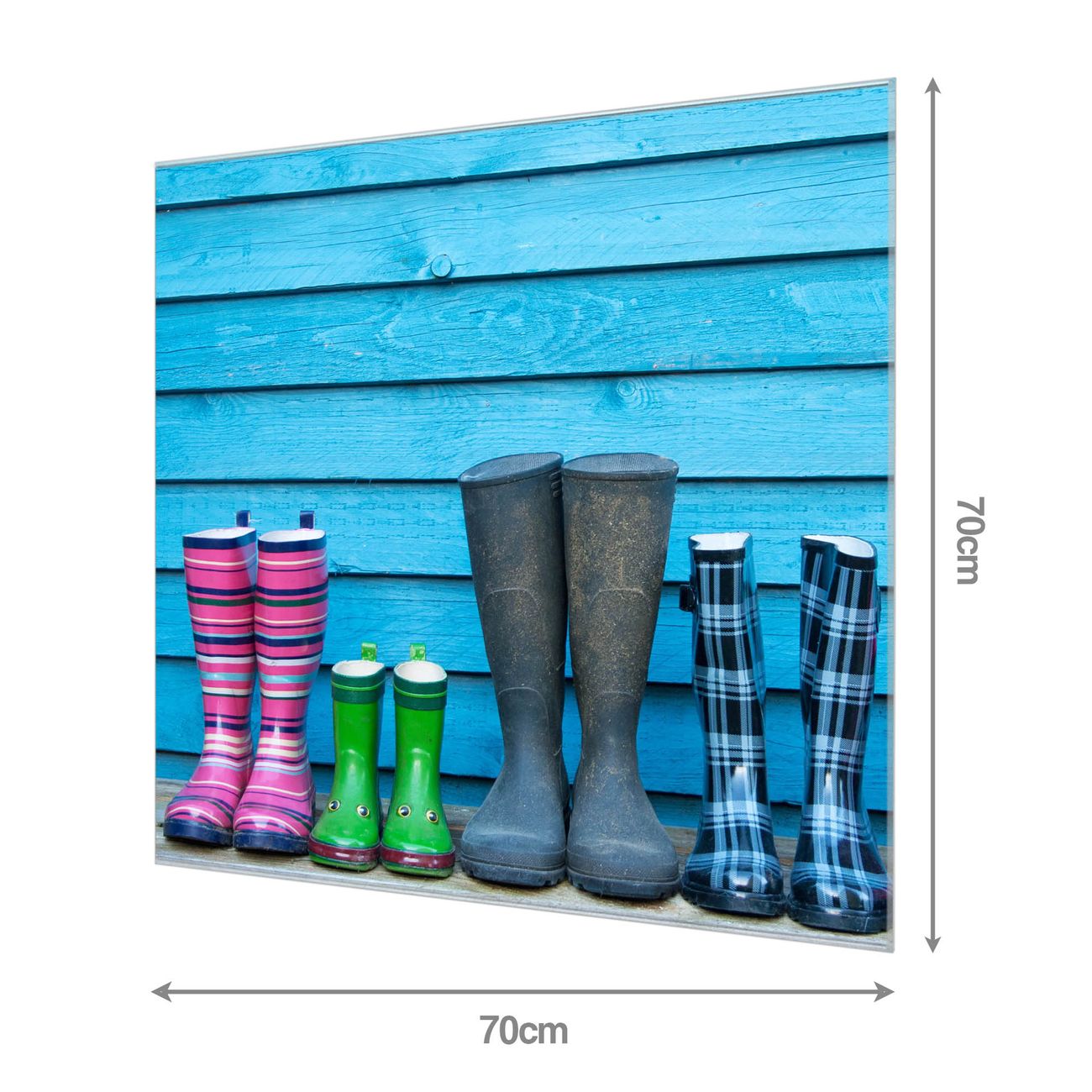 Material: 4mm Sicherheitsglas mit Metallrückwand Eigenschaften: beschreibbar, magnetisch, kratzfest Maße: 70x70x0,6cm, 10,50 kg schwer Motiv Nummer 10359 Gummistiefel Zubehör: inklusive 4 Neodym-Magnete