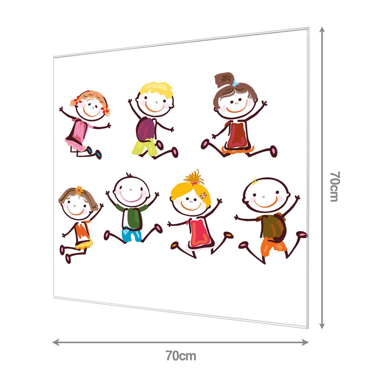 Material: 4mm Sicherheitsglas mit Metallrückwand Eigenschaften: beschreibbar, magnetisch, kratzfest Maße: 70x70x0,6cm, 10,50 kg schwer Motiv Nummer 10250 Happy Kids Zubehör: inklusive 4 Neodym-Magnete