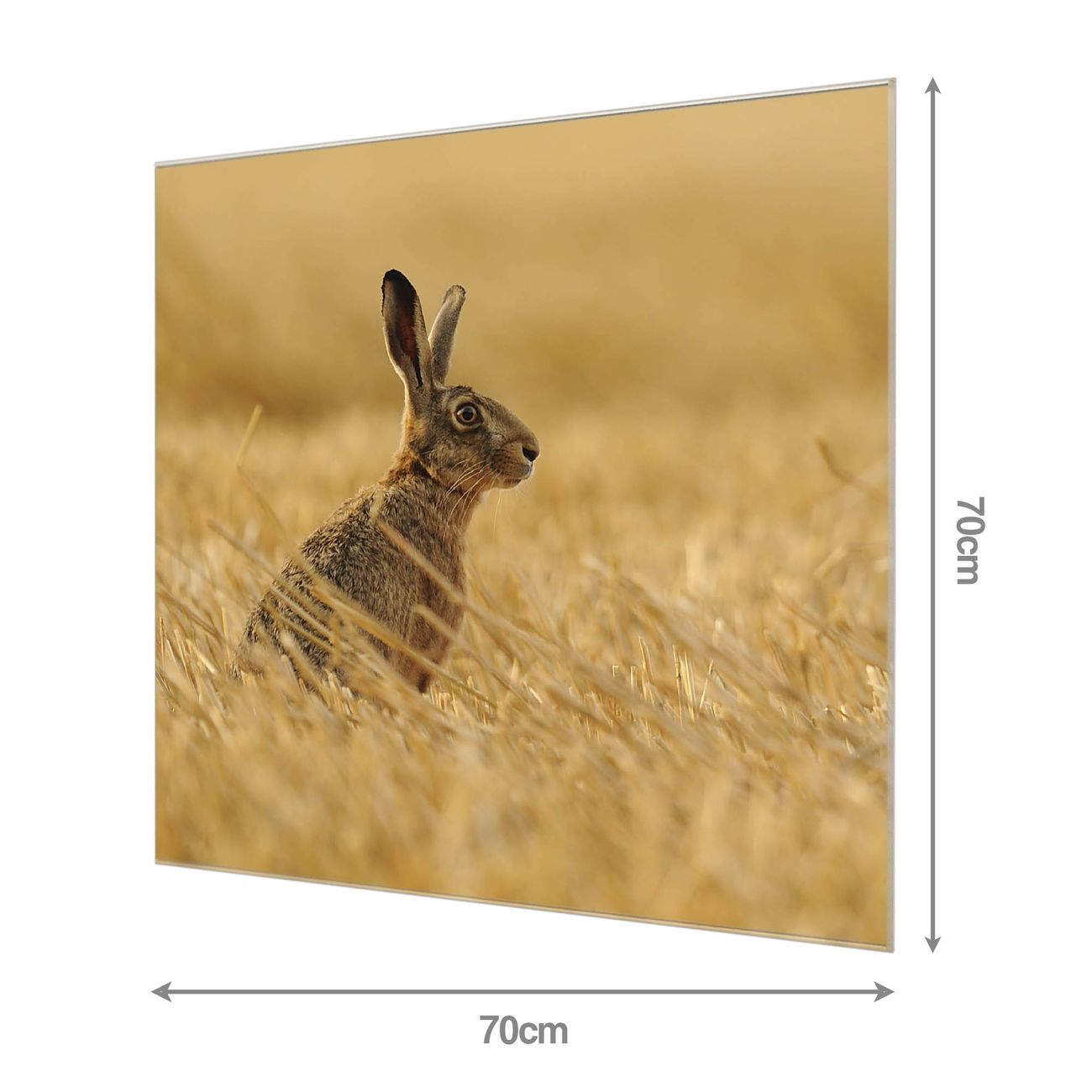 Material: 4mm Sicherheitsglas mit Metallrückwand Eigenschaften: beschreibbar, magnetisch, kratzfest Maße: 70x70x0,6cm, 10,50 kg schwer Motiv Nummer 10496 Hase Zubehör: inklusive 4 Neodym-Magnete