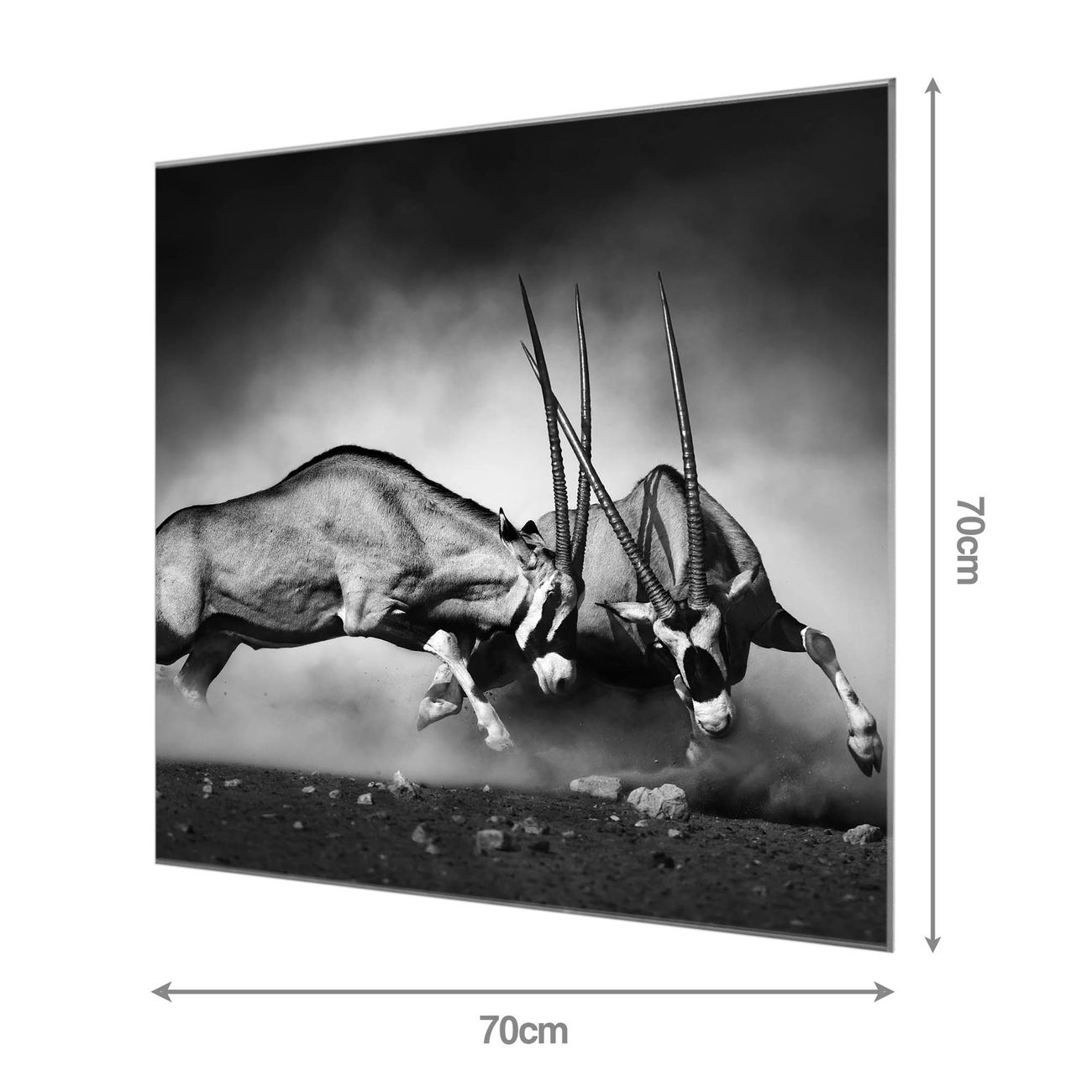 Material: 4mm Sicherheitsglas mit Metallrückwand Eigenschaften: beschreibbar, magnetisch, kratzfest Maße: 70x70x0,6cm, 10,50 kg schwer Motiv Nummer 11578 Head Crash Zubehör: inklusive 4 Neodym-Magnete