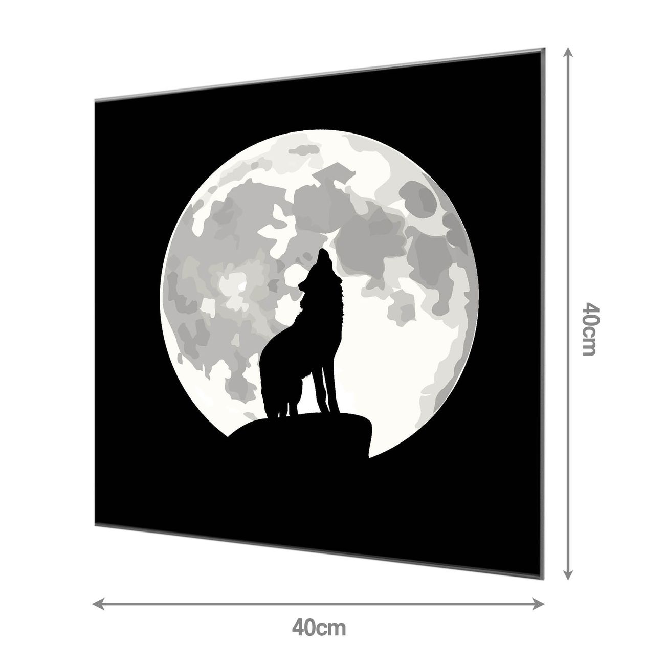 Material: 4mm Sicherheitsglas mit Metallrückwand Eigenschaften: beschreibbar, magnetisch, kratzfest Maße: 40x40x0,6cm, 3,36 kg schwer Motiv Nummer 11023 Heulender Wolf SW Zubehör: inklusive 4 Neodym-Magnete